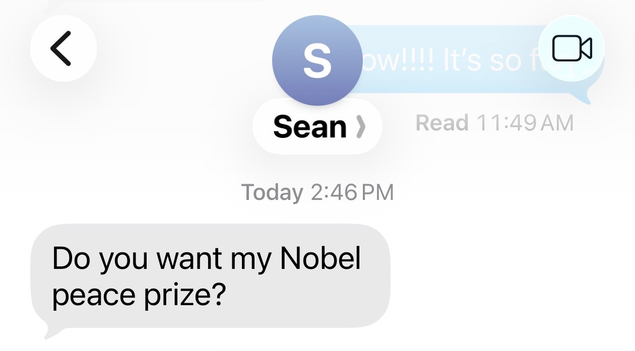 The text came in on Friday afternoon. It was my childhood bestie, Sean. Would I want his Nobel Peace Prize?