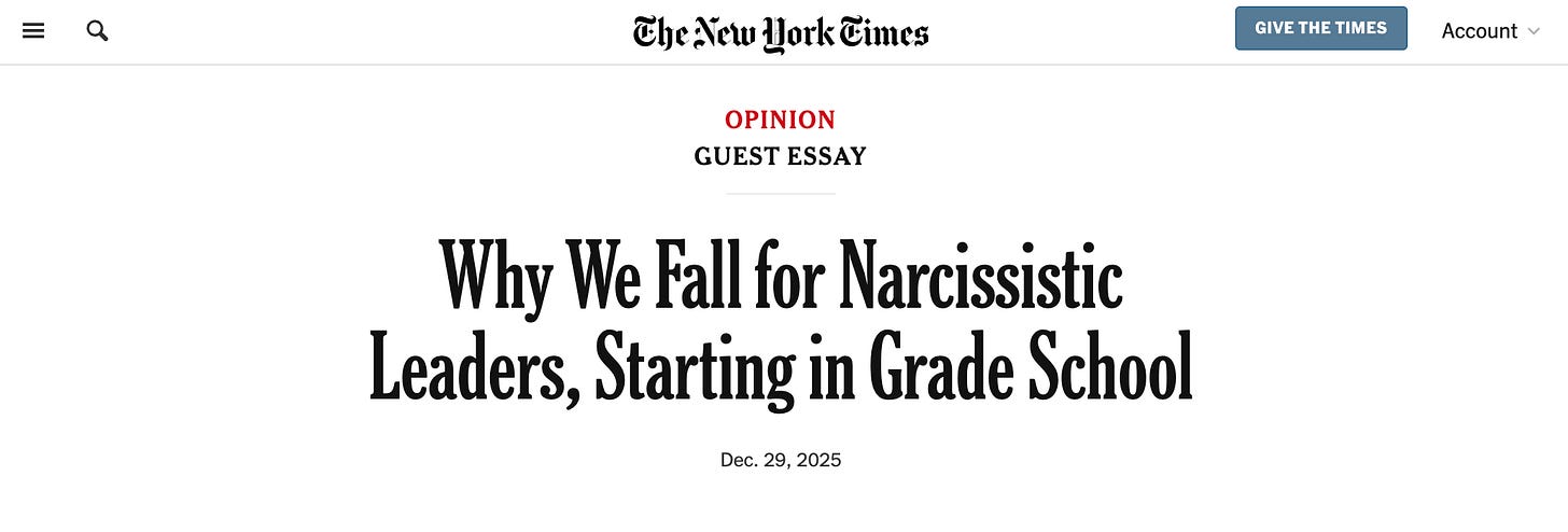 And that's when I read Adam Grant's piece in the New York Times about why we keep falling for narcissistic leaders.