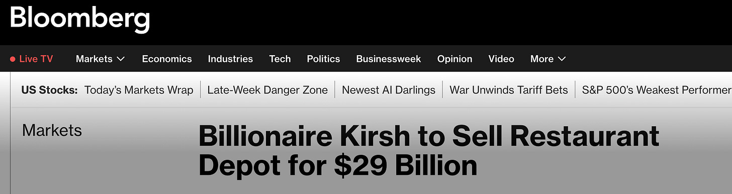I want to close with an inspiring story. This week, quietly (had to do it!), another entrepreneur sold his legacy business for $29 Billion. His name is Nathan Kirsh. I imagine not one soul who reads this knows his name—I hadn’t even though I had been there myself. He is the founder of Restaurant Depot! Shout-out to all my restaurant workers who have made a last-minute trip to the depot in a pinch.