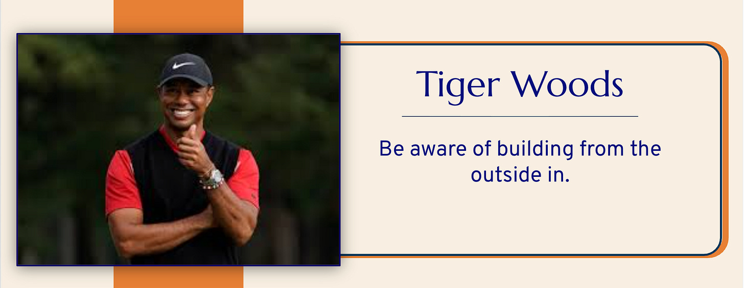This week, in the midst of all of this news, Tiger Woods crashed his car again. I use Tiger in my culture class to contextualize the dangers of building from the outside in. I feel for Tiger. As the child of an alcoholic, I know the lasting scars addiction leaves on entire families. But he said it so clearly in his 30 for 30 documentary years ago: Beware of building from the outside in. He knew his downfall was the brand he spent so much time trying to uphold.