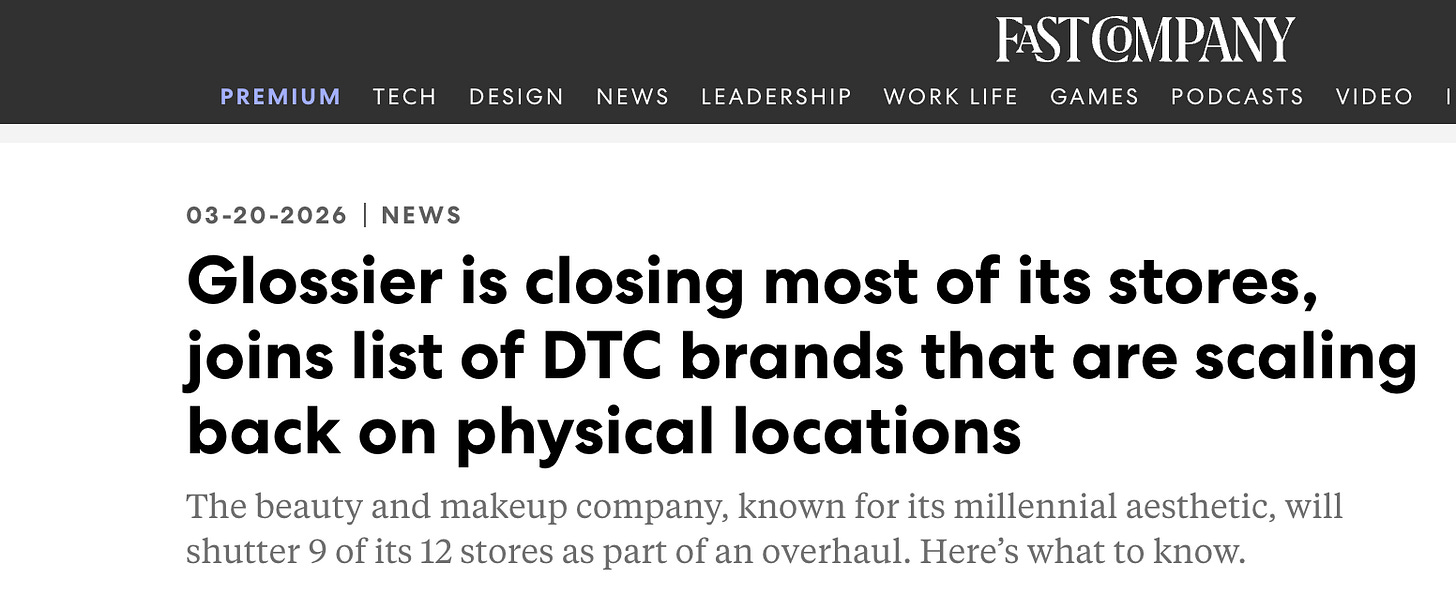 Glossier announced it would close all but 3 stores and lay off roughly a third of its corporate workforce.