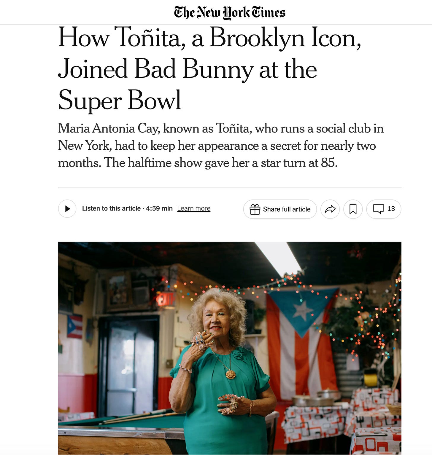 So when Bad Bunny brought South Williamsburg, Toñita, and that community to the Super Bowl, it was joyful to see.
